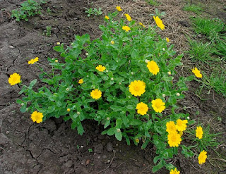 Plant looks like: multiple large yellow daisy like flowers with bright yellow petals and centres, with many branches of toothed greeny-blue leaves. Grows up to 60 cm.